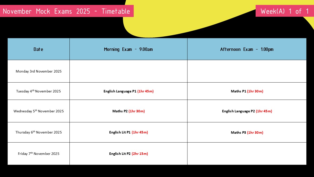 The information on this page is intended to inform you about examination procedures and answer some of the most frequently asked questions to help to guide and support students and parent/carers through the examination process. If you need any further information or have any queries please contact our Examinations Officer, Miss Allan - exams@mortimer.school