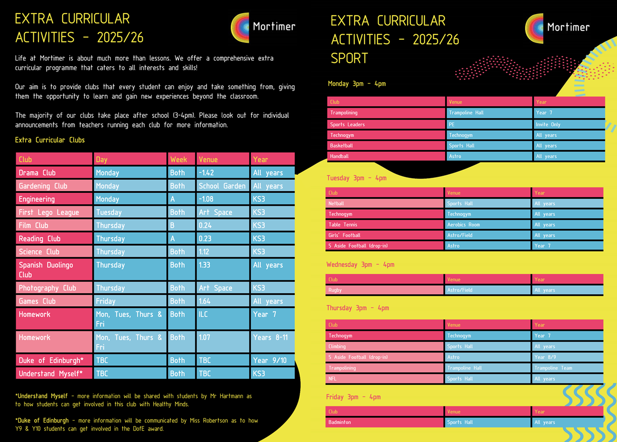 See our leaflets below for details and times for during and after school clubs.